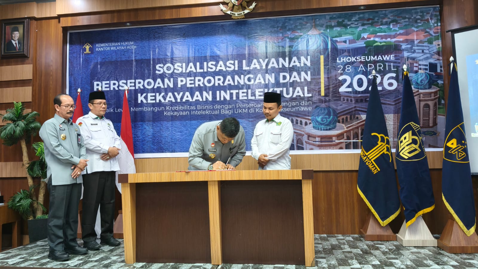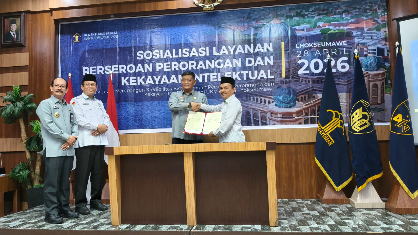 Kegiatan tersebut berlangsung dalam forum Sosialisasi Layanan Administrasi Hukum Umum dan Kekayaan Intelektual bagi para pelaku usaha yang digelar di Hotel Diana, Kota Lhokseumawe, Selasa (28/4/2026). Forum ini menjadi wadah strategis dalam memperkuat pemahaman masyarakat terhadap layanan hukum serta pentingnya perlindungan hak kekayaan intelektual.