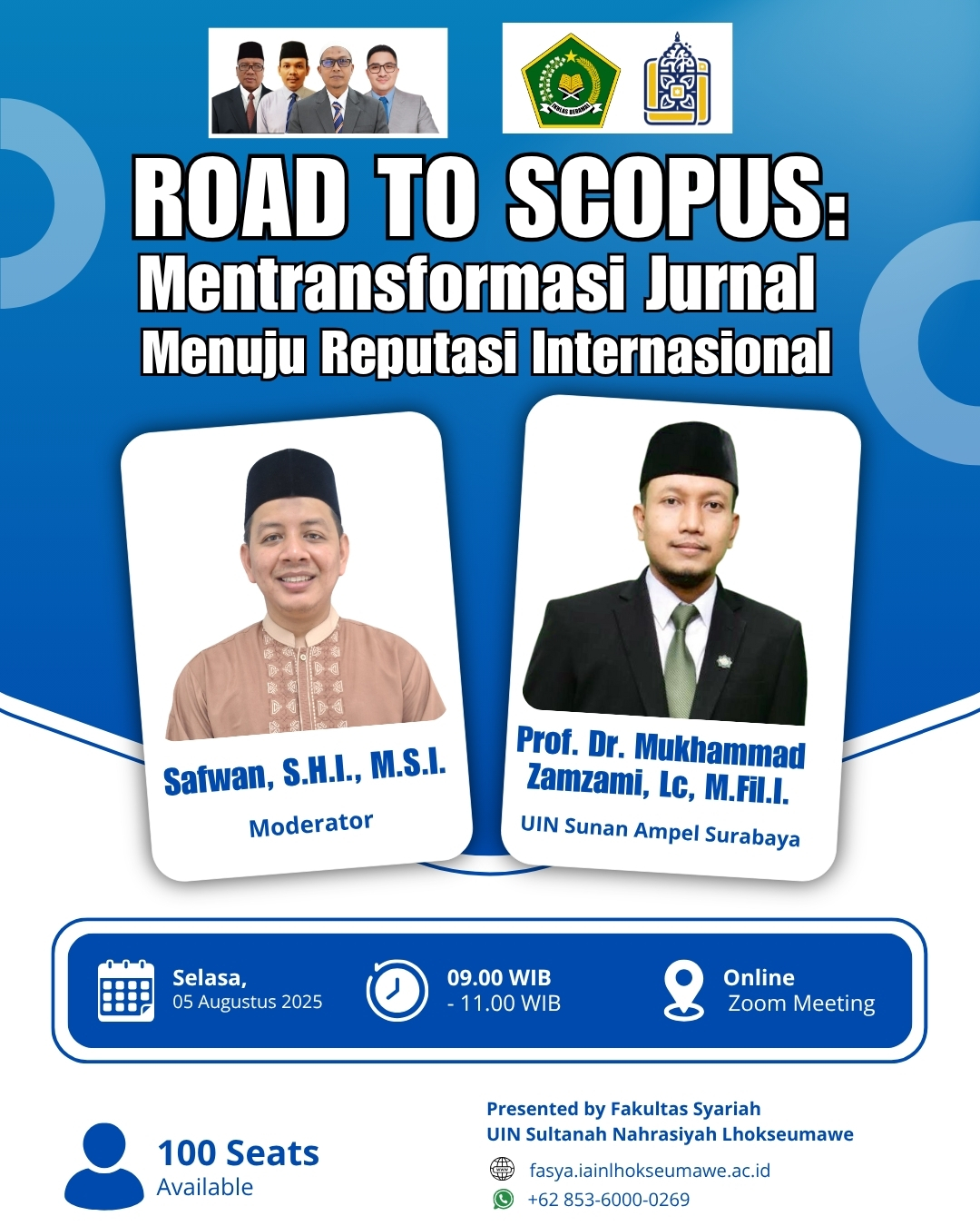 Lhokseumawe – Dalam upaya meningkatkan kualitas dan daya saing jurnal ilmiah menuju reputasi internasional, Fakultas Syariah UIN Sultanah Nahrasiyah Lhokseumawe akan menggelar webinar nasional bertajuk “Road to Scopus: Mentransformasi Jurnal Menuju Reputasi Internasional” pada Selasa, 5 Agustus 2025 mendatang. Acara ini akan berlangsung secara daring melalui platform Zoom Meeting pukul 09.00 hingga 11.00 WIB.