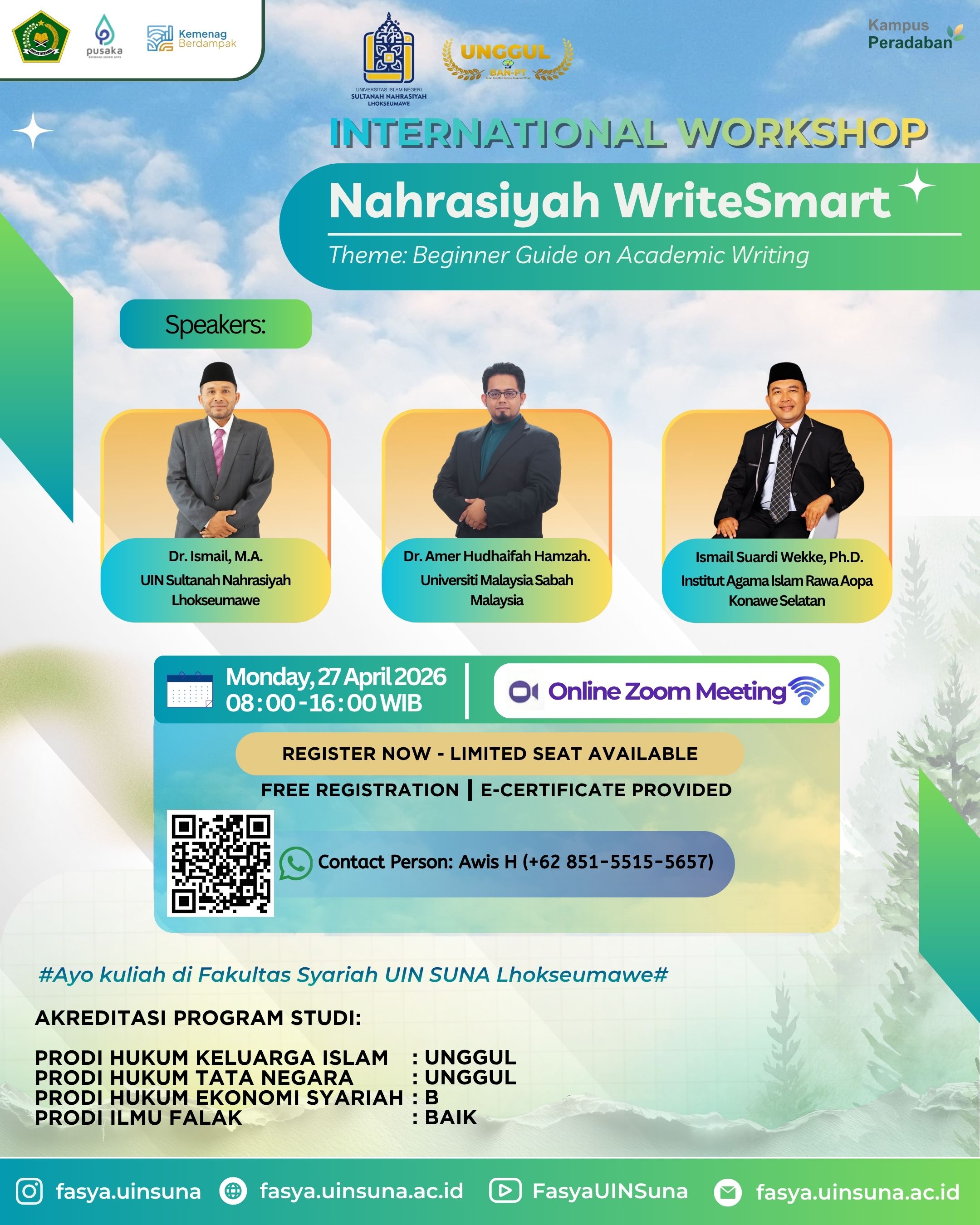 Lhokseumawe — Fakultas Syariah UIN Sultanah Nahrasiyah Lhokseumawe kembali menunjukkan komitmennya dalam meningkatkan kualitas akademik mahasiswa melalui penyelenggaraan International Workshop Nahrasiyah WriteSmart dengan tema "Beginner Guide on Academic Writing." Kegiatan ini akan dilaksanakan secara daring melalui Zoom Meeting pada Senin, 27 April 2026, pukul 08.00 hingga 16.00 WIB, dengan menghadirkan narasumber dari dalam dan luar negeri. Kegiatan ini melibatkan dosen dan mahasiswa sebagai panitia maupun peserta.