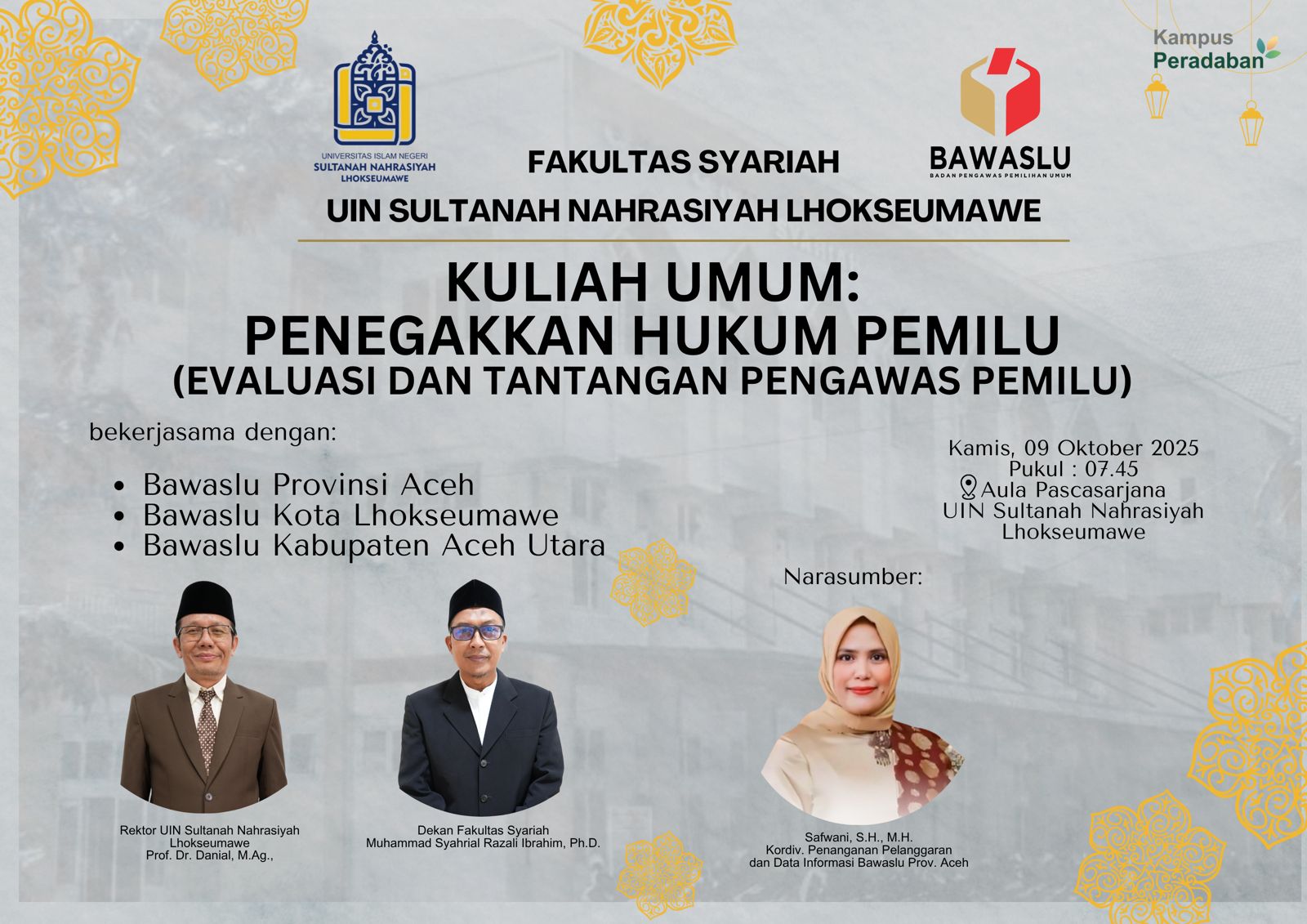 Lhokseumawe – Fakultas Syariah Universitas Islam Negeri (UIN) Sultanah Nahrasiyah Lhokseumawe kembali menunjukkan kiprahnya sebagai fakultas yang berkomitmen tinggi terhadap pelaksanaan Tridharma Perguruan Tinggi yang bermutu dengan menyelenggarakan Kuliah Umum bertajuk “Penegakkan Hukum Pemilu: Evaluasi dan Tantangan Pengawas Pemilu” pada Kamis, 9 Oktober 2025, bertempat di Aula Pascasarjana UIN Sultanah Nahrasiyah Lhokseumawe. Kegiatan ini terselenggara berkat kerja sama strategis antara Fakultas Syariah dan Badan Pengawas Pemilihan Umum (Bawaslu) Provinsi Aceh, serta didukung oleh Bawaslu Kota Lhokseumawe dan Bawaslu Kabupaten Aceh Utara. Ketua Panitia kuliah umum ini adalah Safwan, S.H.I., M.S.I., Sekretaris Jurusan Hukum Ekonomi Syariah (HES). Acara ini dihadiri puluhan mahasiswa Fakultas Syariah khususnya Jurusan Hukum Tata Negara.