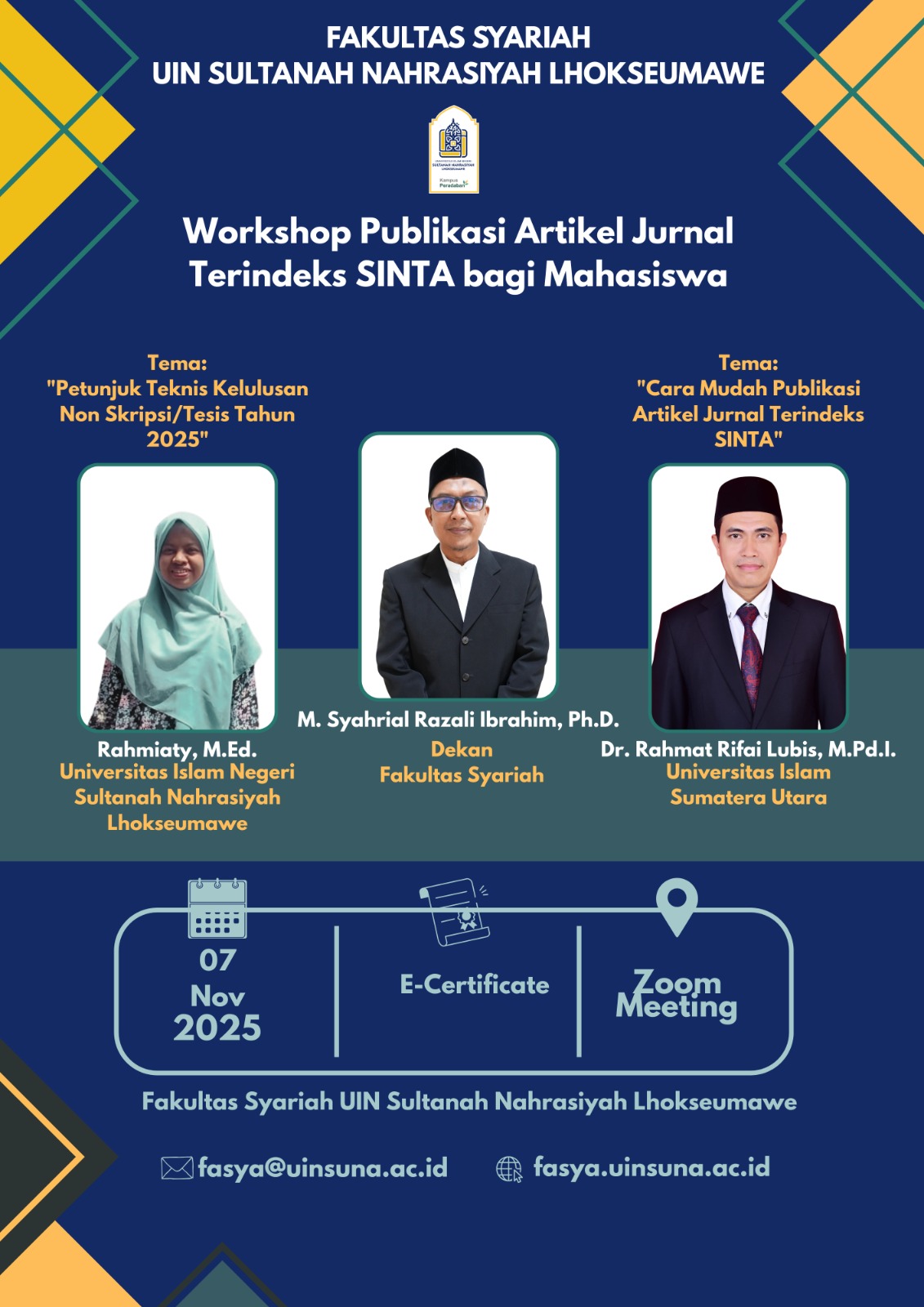 Lhokseumawe - Fakultas Syariah UIN Sultanah Nahrasiyah Lhokseumawe kembali menunjukkan komitmennya dalam peningkatan mutu akademik mahasiswa melalui kegiatan “Workshop Publikasi Artikel Jurnal Terindeks SINTA bagi Mahasiswa”, yang diselenggarakan pada 7 November 2025 secara daring (Zoom Meeting). Kegiatan ini menghadirkan dua narasumber kompeten yang memberikan pembekalan terkait kebijakan terbaru penyelesaian tugas akhir non skripsi dan strategi publikasi artikel ilmiah.